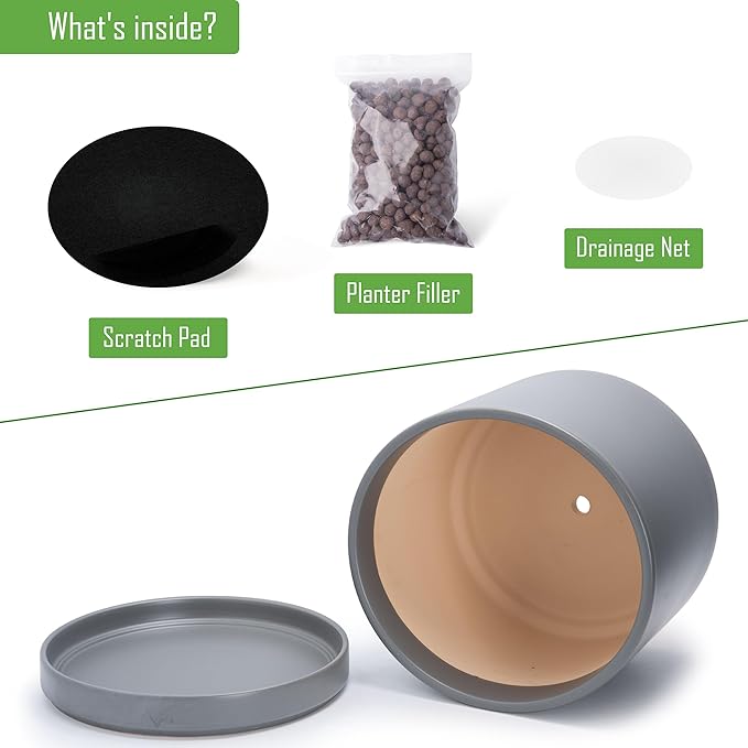 - Planter pot with drainage hole, mesh drainage net and protective scratch pad included.