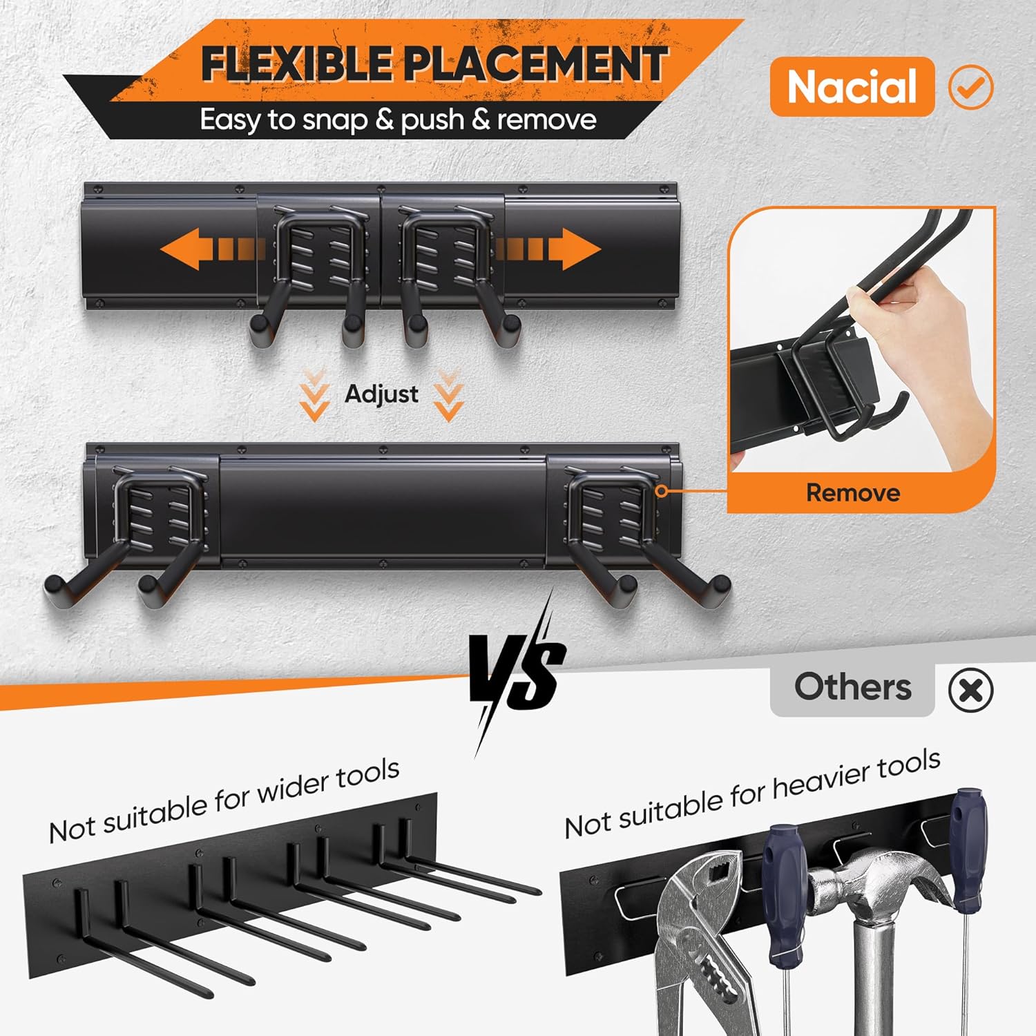 - Buy with Confidence: When you choose Nacial, you're not just getting high-quality garage tool organizer wall mount; you're also gaining peace of mind. Nacial offers 3-Year Limited Warranty, 1-Year Replacement Guarantee, and Lifetime Technology Support. If you need any help [Login > choose "Your orders" > find the order lD >click "CT seller]. With Nacial, you can buy with confidence, Nacial Support is Always ON