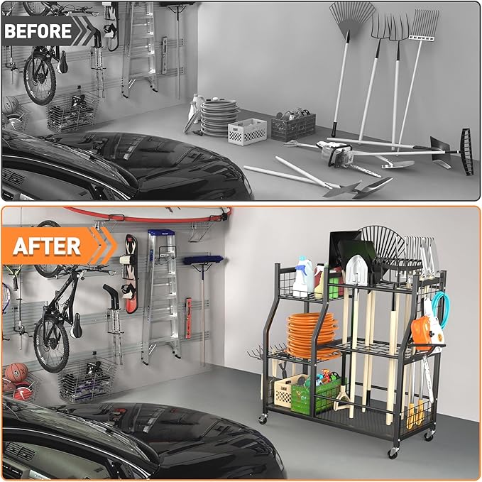 - Free Up Wall Space and Stay Organized: Tired of clutter? our garden tool storage stand keeps your tools like rakes and shovels upright and organized. No more tools falling or scratching walls. Keep your space stays neat and tidy