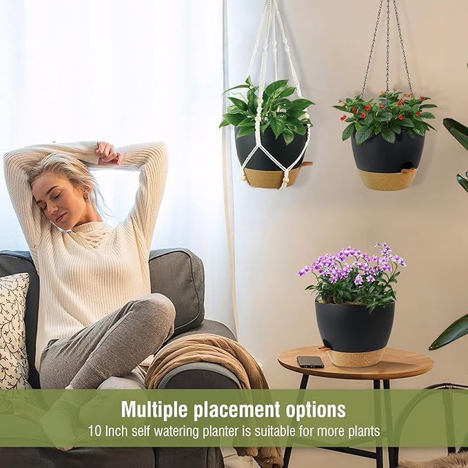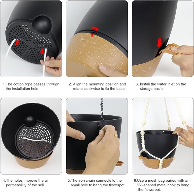- 【Self-Watering Hanging Planter with Removable Tray】This hanging flower pot comes with a detachable bottom tray that acts as a water reservoir, holding a good amount of water. When your plant needs water, it’s absorbed through cotton wicks from the reservoir to the soil, reducing how often you need to water