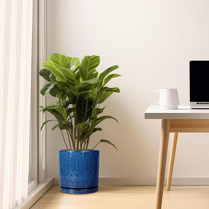 10 Inch Plant Pot - Ceramic Planter Outdoor Plant Pot Indoor with Drainage Holes and Saucer Large Flower Pot Round Decorative Planter for Garden Patio Decor Blue