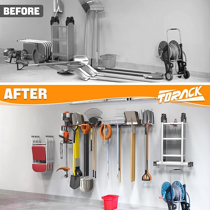 - Declutter Your Space: Get garden tools, folding chairs, ladders, and more off the floor and onto the wall. This tool storage rack frees up valuable garage space while keeping everything neatly organized