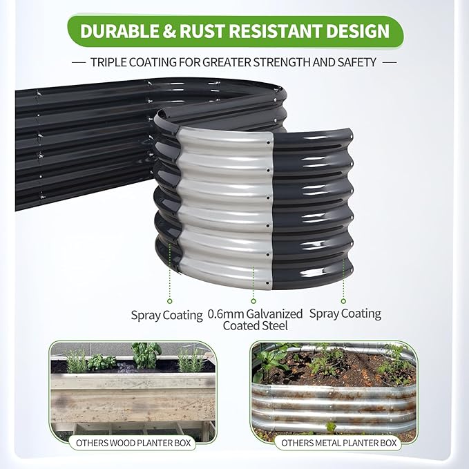 - 【Upgrade Quality & Structure 】The raised garden bed is made of thick galvanized metal with a surface spray coating, which is rust proof and anti-corrosion. Can be used for a long time. The oval design ensures uniform surface force and prevents deformation. More durable than other raised planter box, becoming a good helper for your garden.
