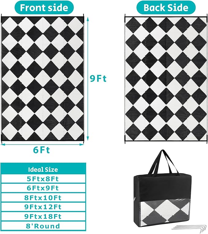 • Versatile Outdoor Carpet: The indoor outdoor plastic rugs have multiple choice in different colors(4'x6',5'x8',6'x9',8'x10',9'x12',9'x18',8'round), is ideal for a variety of indoor outdoor activities,like patio mat, deck rug, garden rug, beach mat, picnic mat, BBQ party mat, rv camping rug,pool rug,outdoor doormat,garage rug,front door mat,allowing you to have plenty of imaginable space for more fun.