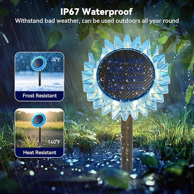 - -4°F to 140°F All-Weather Durability: Solar lights outdoor has passed four rounds of strict quality inspection before leaving the factory. Solar yard lights made of high-strength ABS & PC materials, IP67 waterproof, heat-resistant, frostproof, dustproof, no need to worry about rain, snow and harsh sun affecting the performance of fixtures as outdoor decorations, providing reliable lighting in all seasons