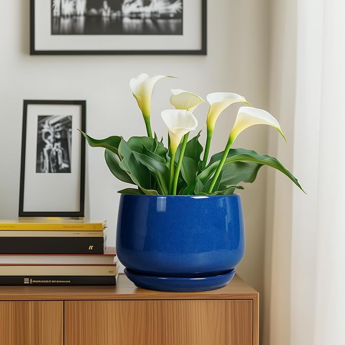 G EPGardening Ceramic Pots for Plants, 9 Inch Modern Round Planter with Drainage and Tray Indoor Outdoor for Flower, Patio Decor, Housewarming Gifts, Blue