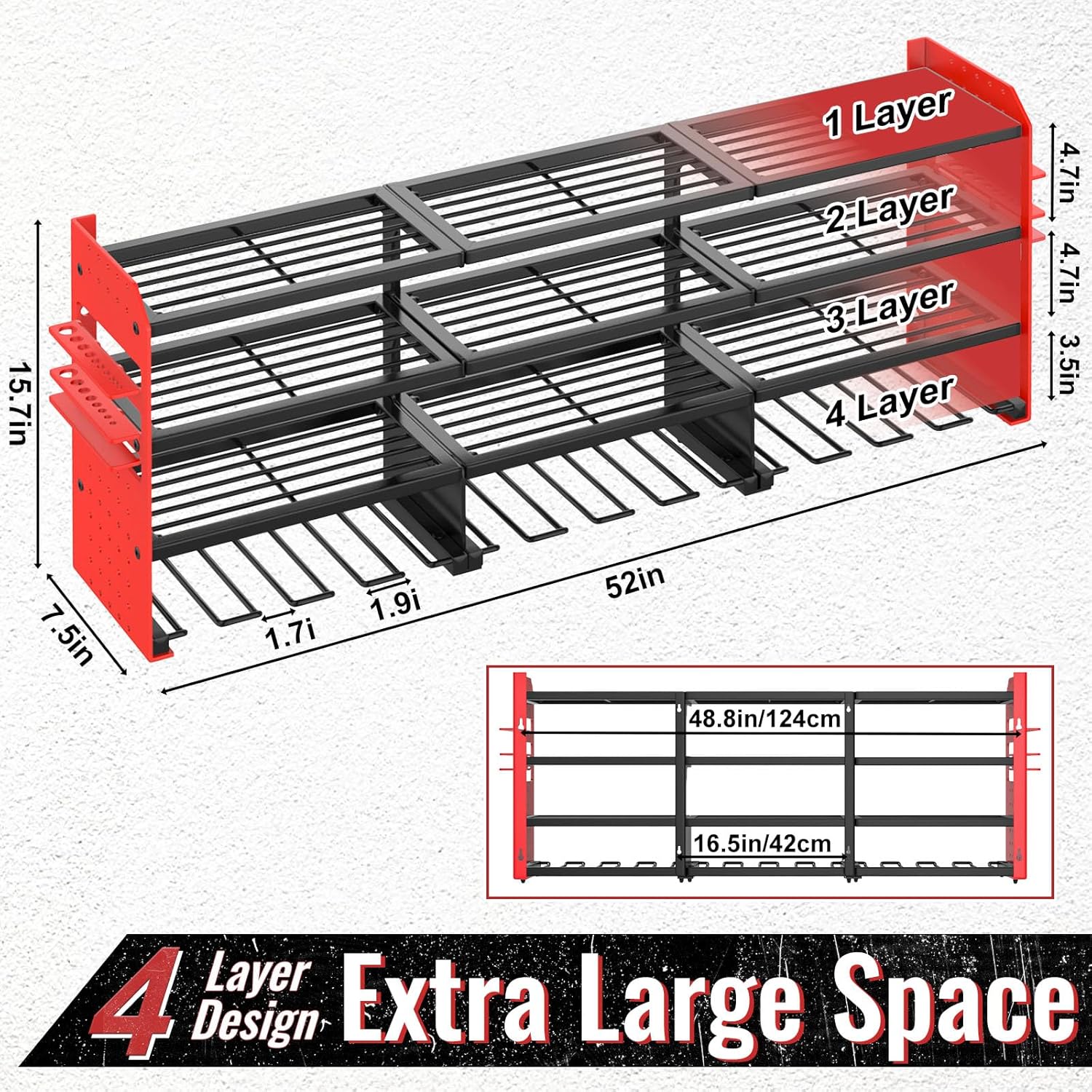 - 【12 Drill High-capacity Storage】This power tool organizer uses the latest four-tier high-capacity design. The bottom layer can store 8 cordless drills, the upper three layers can store other heavy tools or various small tools, and a hammer holder, pliers holder and screwdriver holder are added to the side.providing you a neat and efficient workbench!