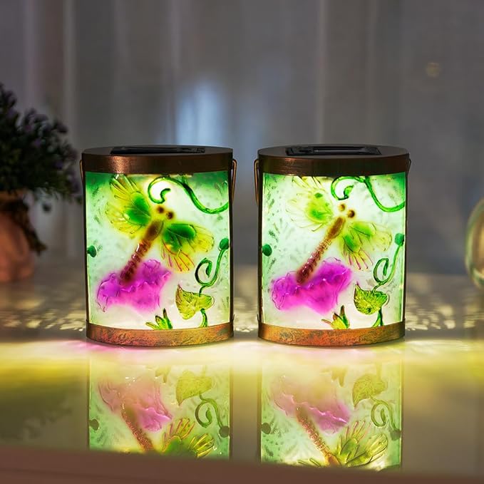 2 Pack Glass Dragonfly Solar Lanterns Outdoor Waterproof, Hanging LED Solar Lantern for Tabletop Garden Patio Decor