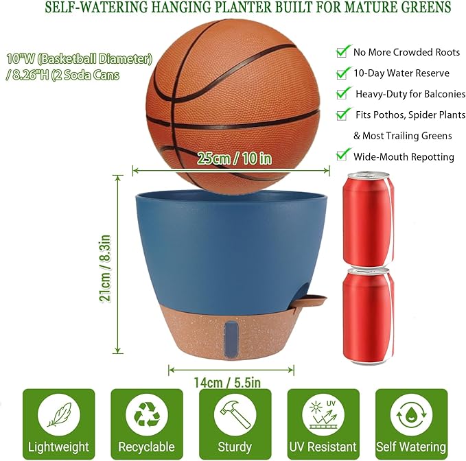- Note: This large hanging planter features a 10-inch wide opening (comparable to a basketball's diameter) and stands 8.26" tall (about the height of two standard soda cans). Designed specifically for mature plants like spider plants and pothos, it is not recommended for small succulents or tight spaces. Always measure your current pots or intended placement area before purchase to ensure the dimensions meet your needs.