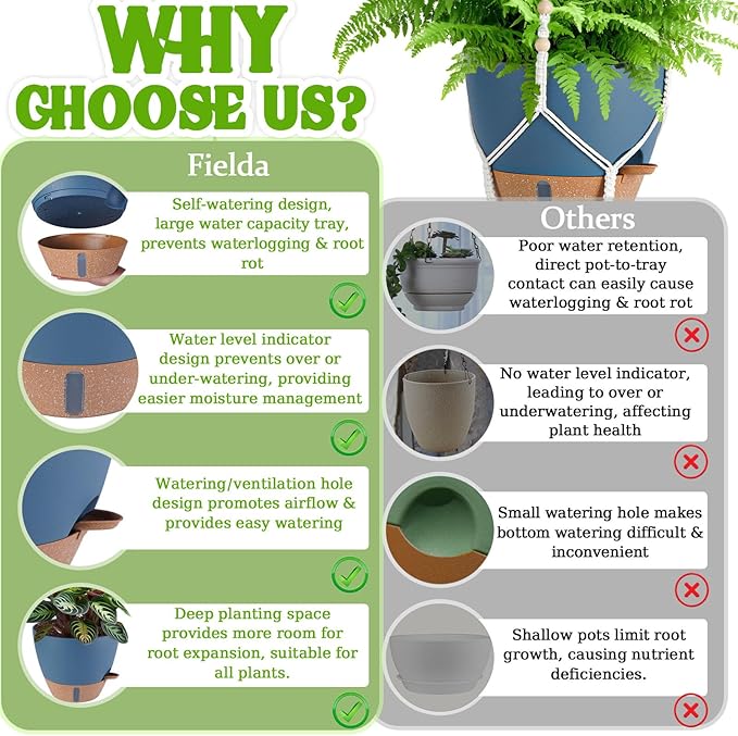 - 【Never Over/Underwater Again!】Fielda's indoor hanging planters feature an EXCLUSIVE WATER WINDOW in the base tray - instantly check moisture levels without guesswork! Protect your plants from dehydration and promote healthy root systems with this visual watering guide. Perfect for hanging pots for indoor plants enthusiasts who value scientific plant care.