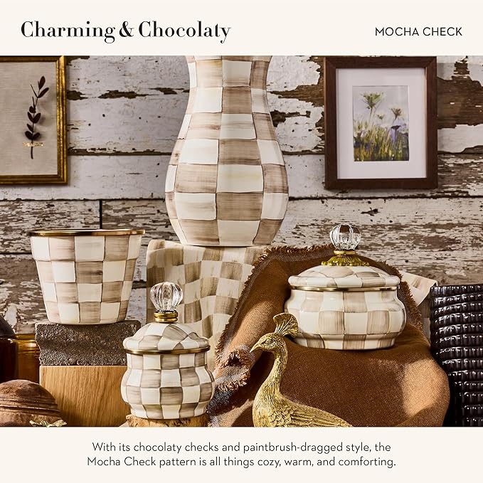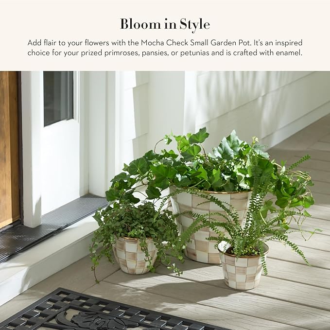 MACKENZIE-CHILDS Enamel Garden Pot, Decorative Pot for Plants, Outdoor Flowerpot Decor, Small, Brown-and-White Mocha Check