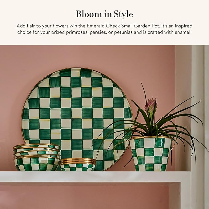 MACKENZIE-CHILDS Enamel Garden Pot, Decorative Pot for Plants, Outdoor Flowerpot Decor, Small, Green-and-White Emerald Check