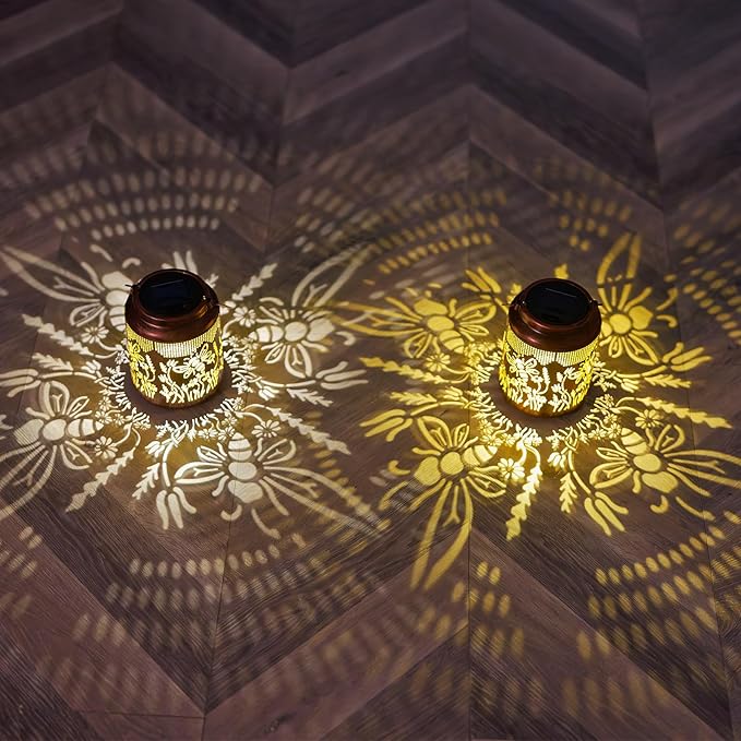- 【Perfect Garden Decorations】:Bee solar lantern can project unique and beautiful bee and flower patterns in a dim environment,creating a gorgeous and warm atmosphere to bring life and fun to your garden and attract your family or friends.The Bee outdoor solar lantern unique hollow out design and beautiful red copper color give it an artistic touch,Specially suitable as outdoor decor,yard decor,porch decor,patio decor and other outdoor scene decorations