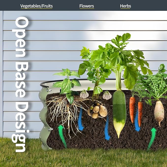 - Open Bottom Design: Open base provides good drainage and effectively protects the roots from rotting due to excessive watering. Metal garden bed is perfect for growing fresh vegetables, fruits, and flowers in your garden or greenhouse