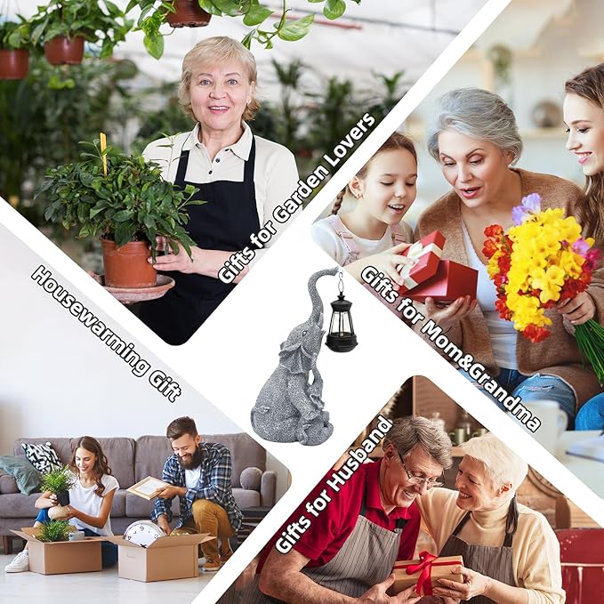 - CUTE GARDEN ELEPHANT STATUE: baby elephant snuggles in mother's arms, elephant tilts its trunk and hangs a solar lantern. In a natural setting, the elephant statue will be more realistic, adding nature and warmth to your home and garden. Elephants symbolize good luck in many cultures and elephant statues can also be given as gifts to family and friends.