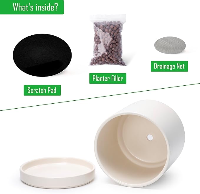 - Planter pot with drainage hole, mesh drainage net and protective scratch pad included.