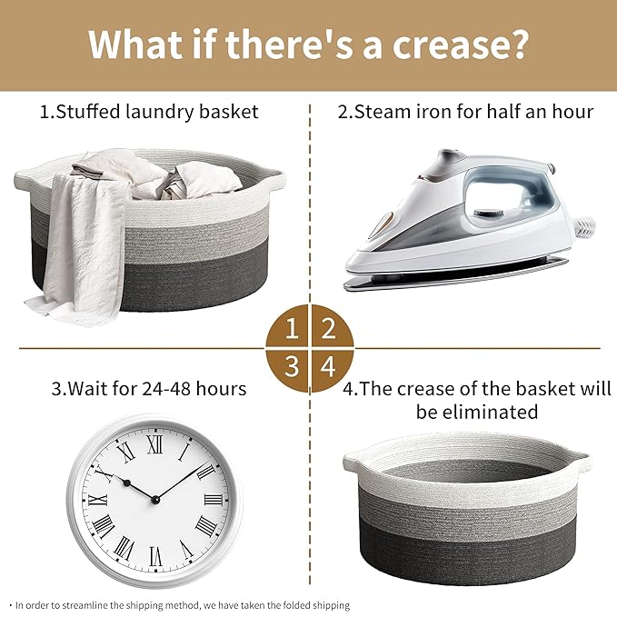 - Note: Blankets basket comes folded and may have creases. Fully fill the rope basket with towels or clothes and wait for 1-2 days will help reshape the blanket basket. Alternatively, use steam or ironing for a quick reshape the laundry basket