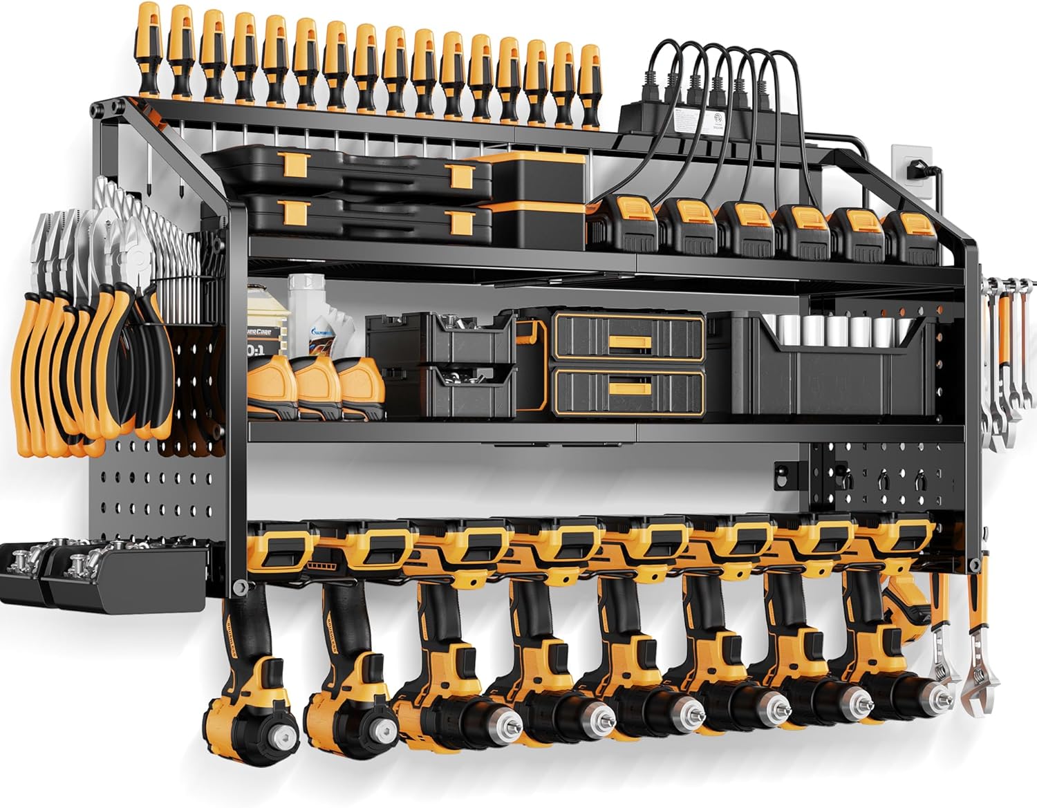 - 【All Garage Tool Storage Station】This wall-mounted tool holder come with 8 slots, 8 hooks, 2 Accessories Storage Box, 6 Screwdriver Storage Holes, 1 Drill Bit Storage Rack.You can store your charging stations, batteries, toolboxes, drill bits, hammers, And other garage tools, Keep tools organized in the work area and save your bench space.