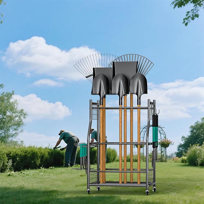 - Flexible Movement & Locking: Equipped with four heavy-duty wheels, this garden tool stand moves easily on uneven ground or grass. Two wheels feature a locking function to secure the rack in place when needed