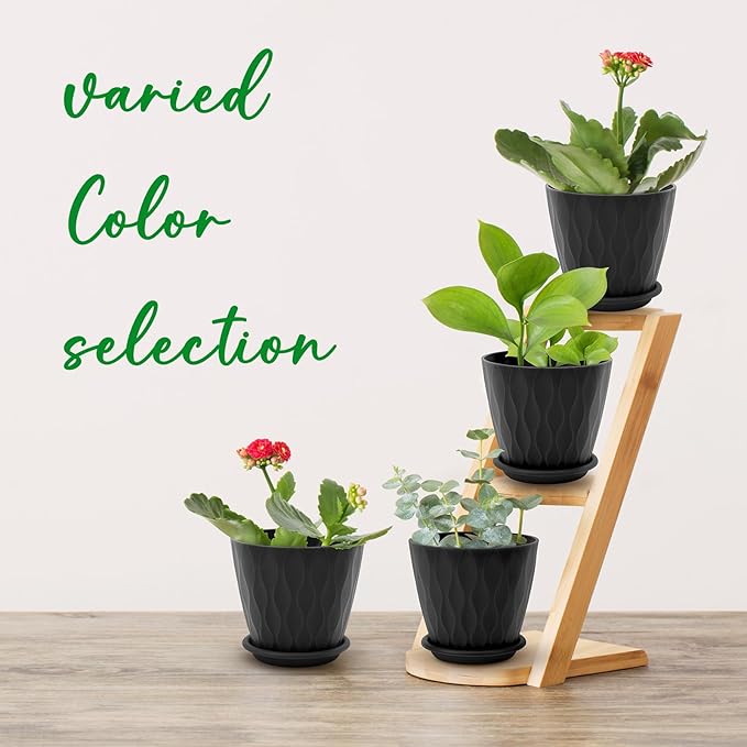 4 inch Plant Pots, 5 Pack Flower Pots Outdoor Indoor, Planters with Drainage Holes and Tray Saucers(Black)
