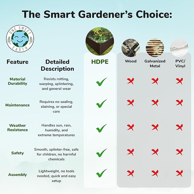 - SAFE, ECO-FRIENDLY GARDENING: Made from non-toxic, BPA-free plastic, this raised bed is 100% recyclable, offering a sustainable option for growing your herbs, vegetables, and flowers. Enjoy peace of mind knowing your garden is safe for both plants and the planet.