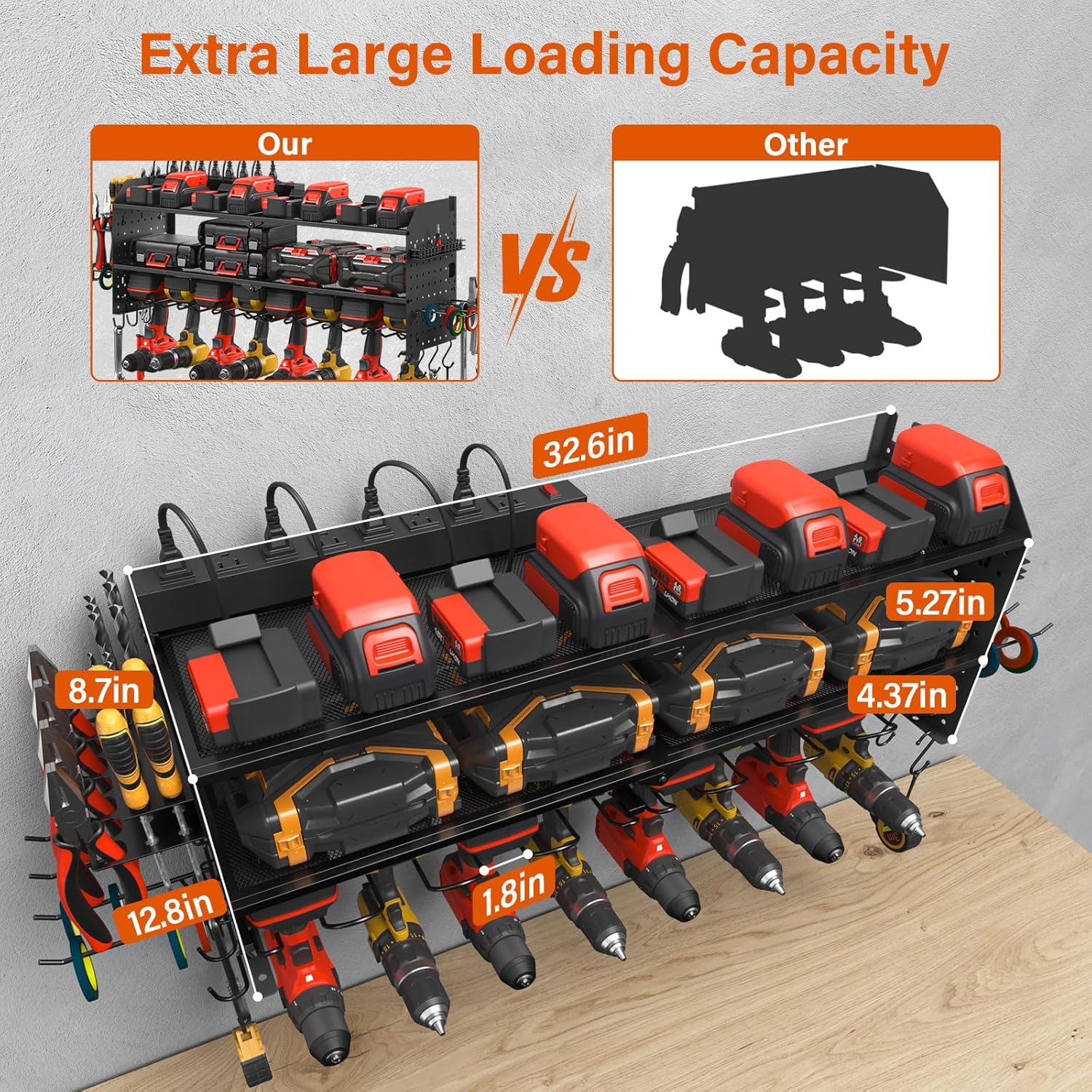 - Large power tool organizer with 8 outlet power strip, three-tier large capacity design allow to store 8 drills on the bottom tier, batteries, chargers and other tools on the top two tiers. Two side pegboard extension comes with 8 long hooks, 8 hooks, and 1 screwdriver organizer rack and 1 magnetic bits organizer.