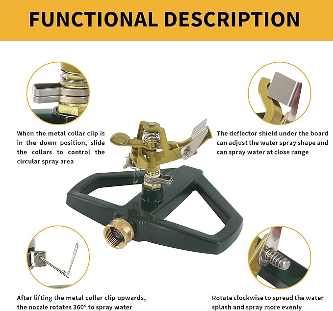 - 【Durable 100% Metal Construction for Long-Lasting Use】 Both the base and the head of our impact sprinkler are crafted from premium zinc alloy, ensuring exceptional durability and resistance to rust, corrosion, and wear. Designed to withstand harsh weather conditions and frequent use, this 100% metal sprinkler guarantees years of reliable performance, making it the perfect choice for maintaining your lawn and garden.