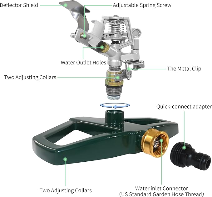 - 【Durable 100% Metal Construction for Long-Lasting Use】 Both the base and the head of our impact sprinkler are crafted from premium zinc alloy, ensuring exceptional durability and resistance to rust, corrosion, and wear. Designed to withstand harsh weather conditions and frequent use, this 100% metal sprinkler guarantees years of reliable performance, making it the perfect choice for maintaining your lawn and garden.