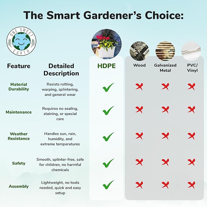 - SAFE, ECO-FRIENDLY GARDENING: Made from non-toxic, BPA-free plastic, this raised bed is 100% recyclable, offering a sustainable option for growing your herbs, vegetables, and flowers. Enjoy peace of mind knowing your garden is safe for both plants and the planet.