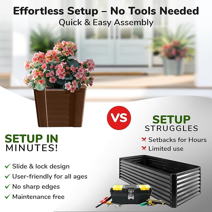 - EASY ASSEMBLY, NO TOOLS REQUIRED: With a snap-together design, setting up your garden bed takes just minutes! No screws or tools necessary, making this a hassle-free choice for busy gardeners looking for a simple and quick setup.