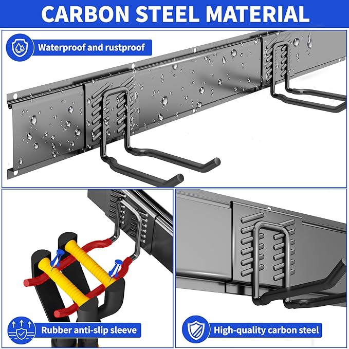 - HEAVY-DUTY 300 LBS CAPACITY: garage organizers and storage Constructed from premium steel with a rust-resistant, double powder-coated finish. Rubber-coated hooks prevent slipping. Built for long-lasting durability in your garage or garden
