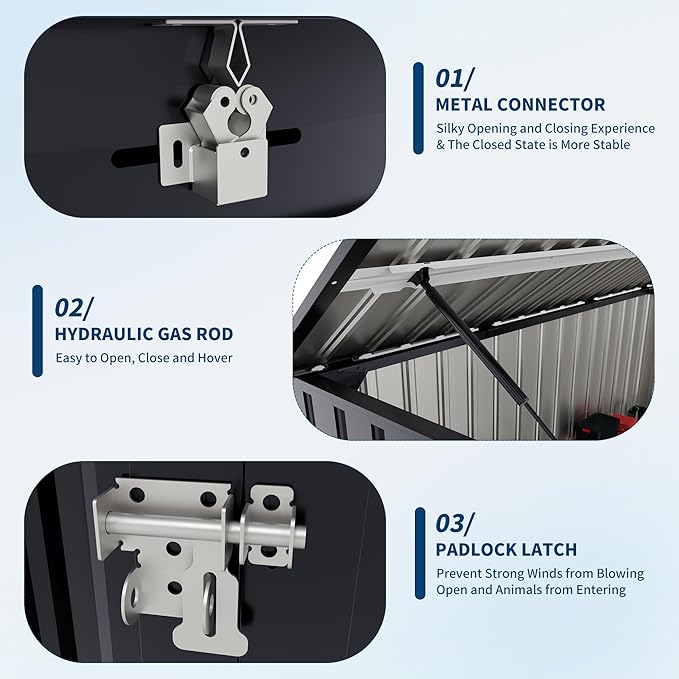 - REFINED MATERIAL & SOLID STRUCTURE - The metal garbage can storage shed, constructed with galvanized steel and coated in black powder, exhibits exceptional sturdiness and durability for long term usage. The superior structural design guarantees the top has an exceptional load bearing capacity, enabling it to withstand winds of up to six levels. This resilient material is resistant to UV rays, ensuring that it will not fade or discolor after prolonged exposure to the sun