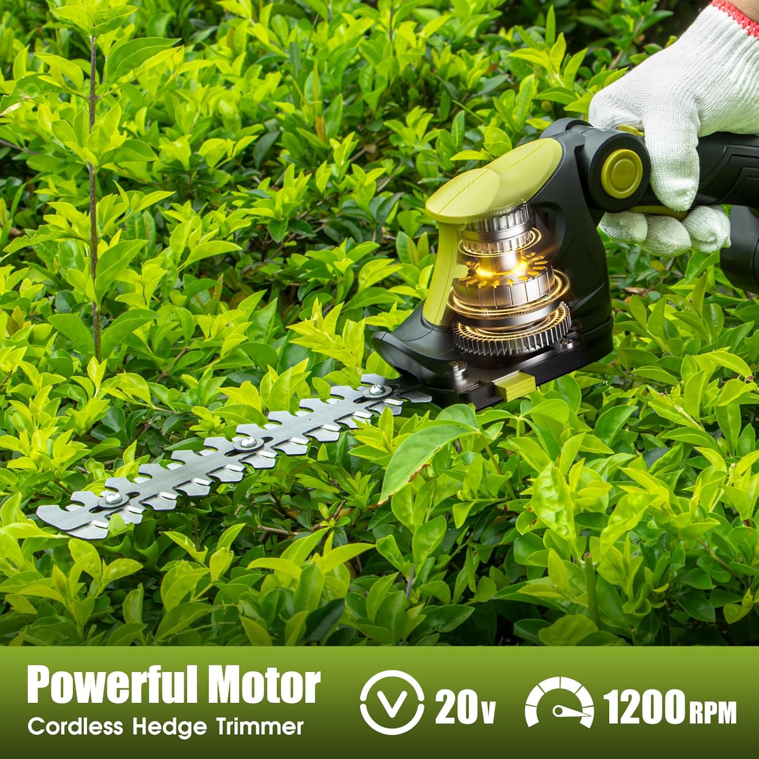 - [DOUBLE SAFETY LOCK FEATURES] Your safety is of utmost importance to us! Our handheld electric hedge trimmer is equipped with essential safety features. Blade guards and a safety switch are in place to prevent accidental injuries. The upper trigger safety lock - out ensures that the tool won't start unexpectedly. To operate, simply push the trigger lock and press the trigger at the same time. Blade switching is a cinch – just press the buttons on both sides; no additional tools are required.