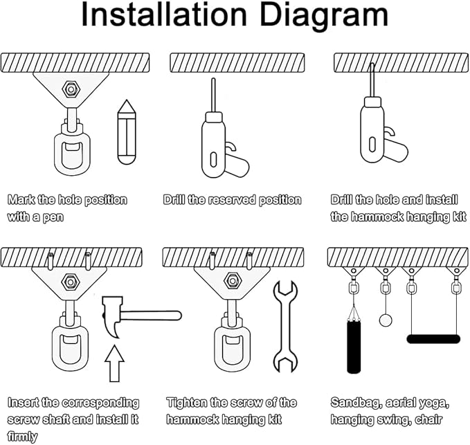 - Widely Used in Wood and Concrete: Our swing hardware provides 2 screws for wood and 2 expansion bolt for concrete. Heavy duty hammock hanging kit for ceiling, punching bag, porch swing, hammock, swing chair, ring, yoga swing, boxing equipment, hammocks, chairs, beds, baskets, furniture, swings, hammock hanging kit, hammock chair hanging kit, porch swing hanging kit, hanging chair hardware.