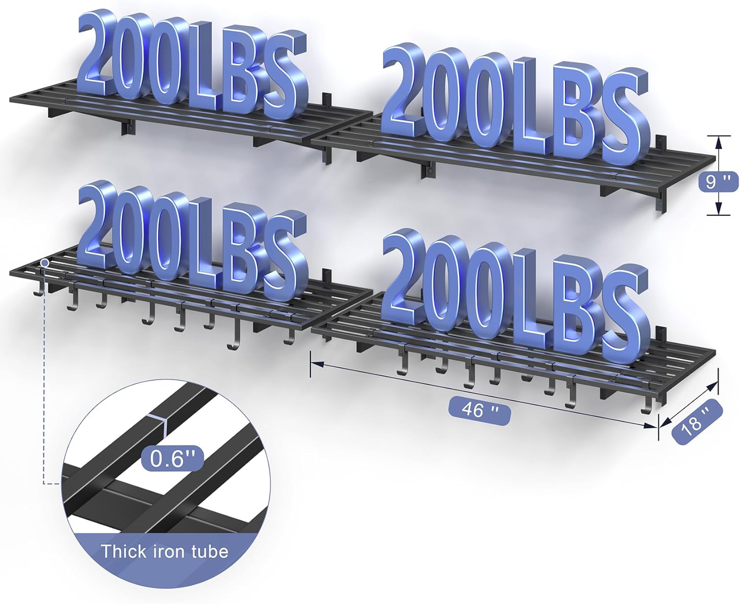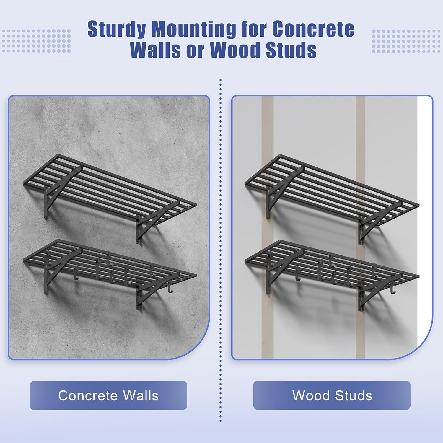 - PREMIUM STRENGTH & STABILITY: Engineered with heavy-duty steel, our wall shelf system features reinforced square tube supports, a seamless integrated frame, and secure U-hooks for superior durability. Every component undergoes rigorous quality testing to ensure maximum safety and long-lasting performance