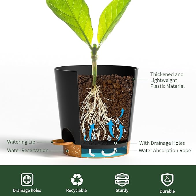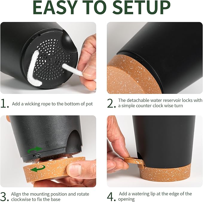 - Self-Watering Planter System:These 4 inch small self watering plant pots feature a built-in wick rope that draws water from the reservoir, ensuring consistent hydration for your indoor and outdoor plants. Perfect for busy plant owners and those who forget to water!