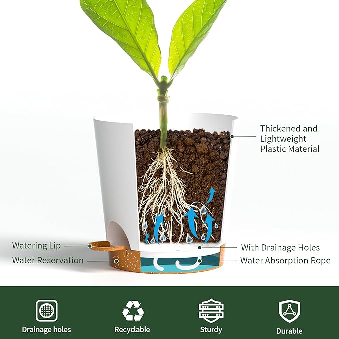 - Self-Watering Planter System: Our 4 inch small self watering plant pots feature a built-in wick rope that draws water from the reservoir, ensuring consistent hydration for your indoor and outdoor plants. Perfect for busy plant owners and those who forget to water!