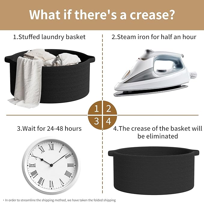 - Note: Blankets basket comes folded and may have creases. Fully fill the rope basket with towels or clothes and wait for 1-2 days will help reshape the blanket basket. Alternatively, use steam or ironing for a quick reshape the laundry basket