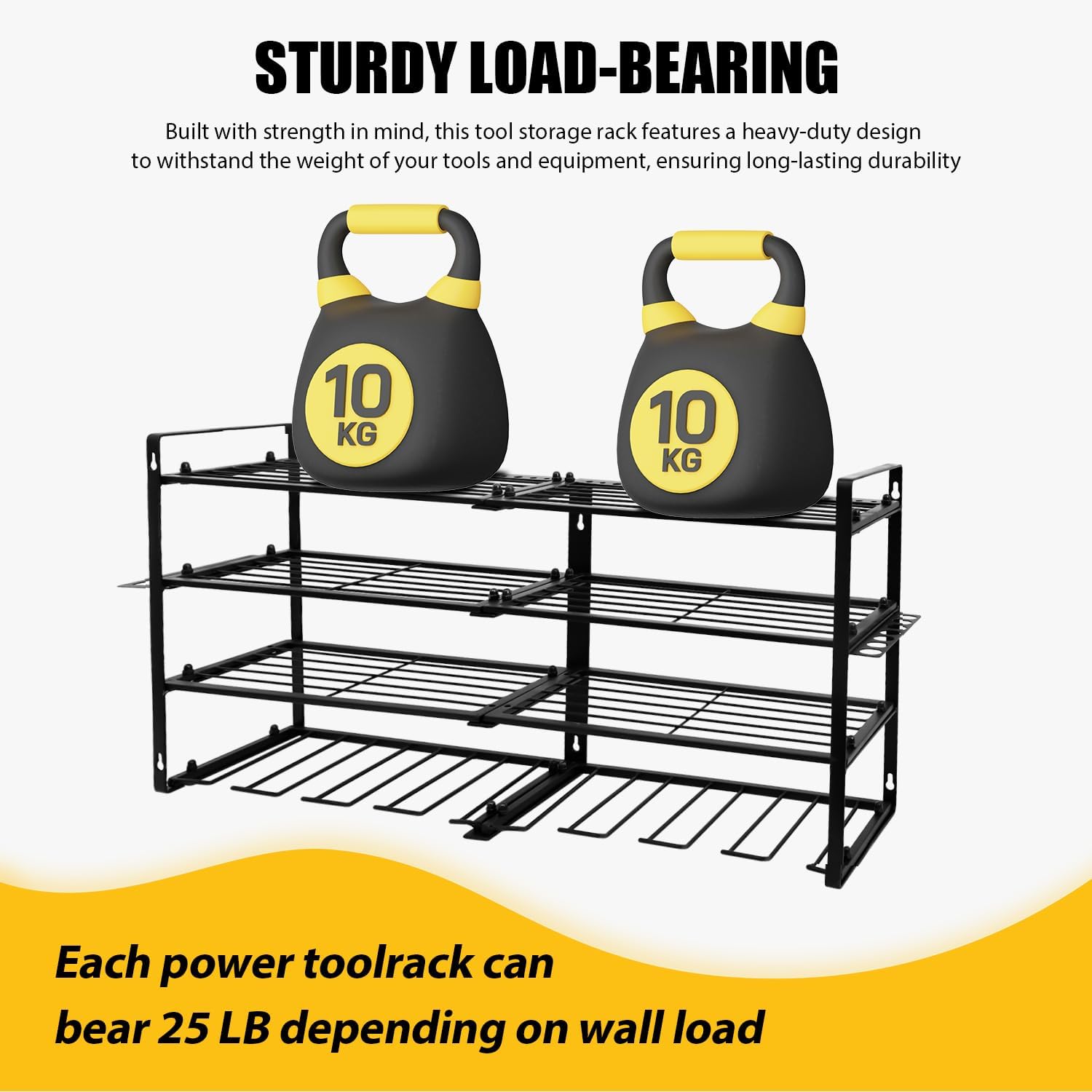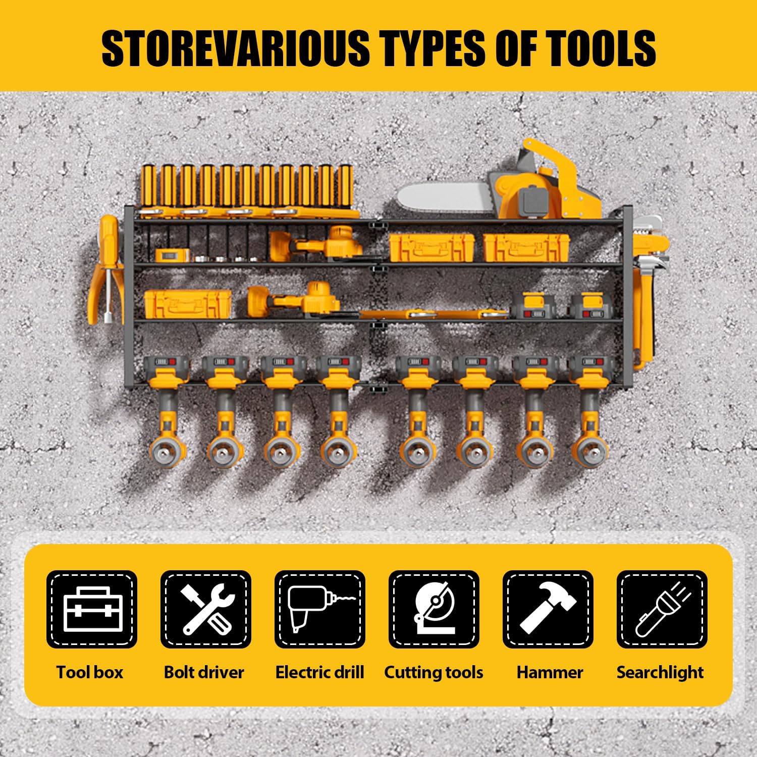 - [Heavy Duty & Durable] - Made of heavy-duty steel with a strong powder coating, this power tool organizer is robust, rust-resistant, and non-fading for long-time use. The storage rack's joint has a reinforced design for heavy-duty strength and even weight distribution, so there is no need to worry about bending or breaking.
