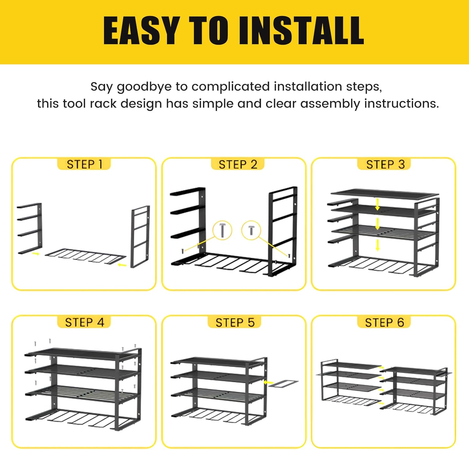 - [Heavy Duty & Durable] - Made of heavy-duty steel with a strong powder coating, this power tool organizer is robust, rust-resistant, and non-fading for long-time use. The storage rack's joint has a reinforced design for heavy-duty strength and even weight distribution, so there is no need to worry about bending or breaking.