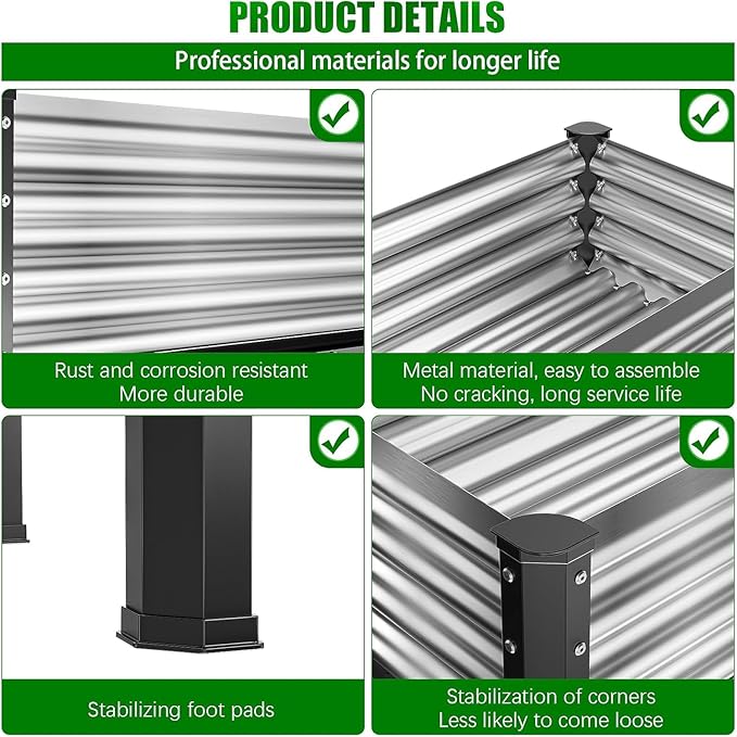 - 【Distinctive Design】-Outdoor elevated garden beds, our custom design style features galvanized sheet metal on the top, a stainless steel frame on the middle base, and the lower four corners are made of heavy-duty steel with a black powder-coated finish,This combination exceeds the lifespan of wooden products and ensures excellent rust resistance to keep the garden bed in the best condition for a long time.